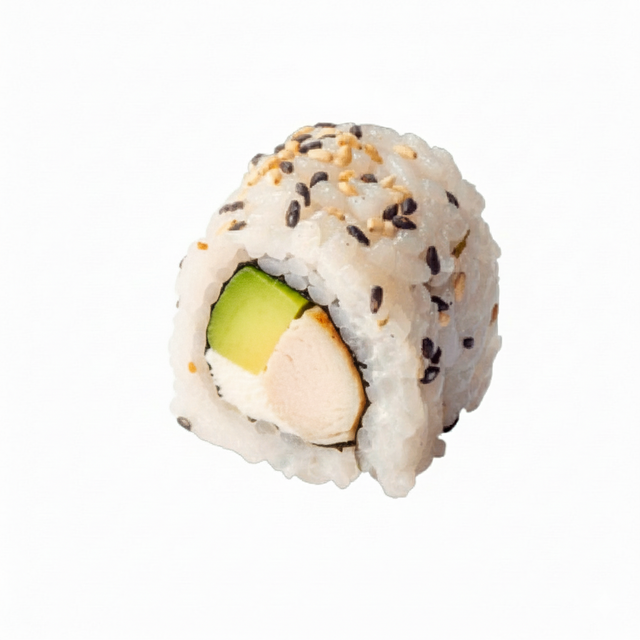 8 pièces : Rouleaux de riz parfumé, graines de sésame et feuille d’algue Nori, Poulet rôti Avocat et Cheese